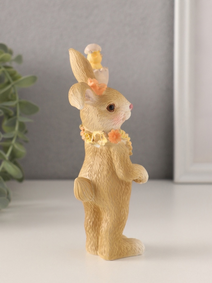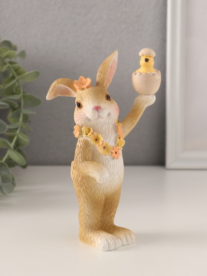 Сувенир полистоун "Зайчик в цветочном венке и цыплёнком в скорлупе" 9х5,5х15 см