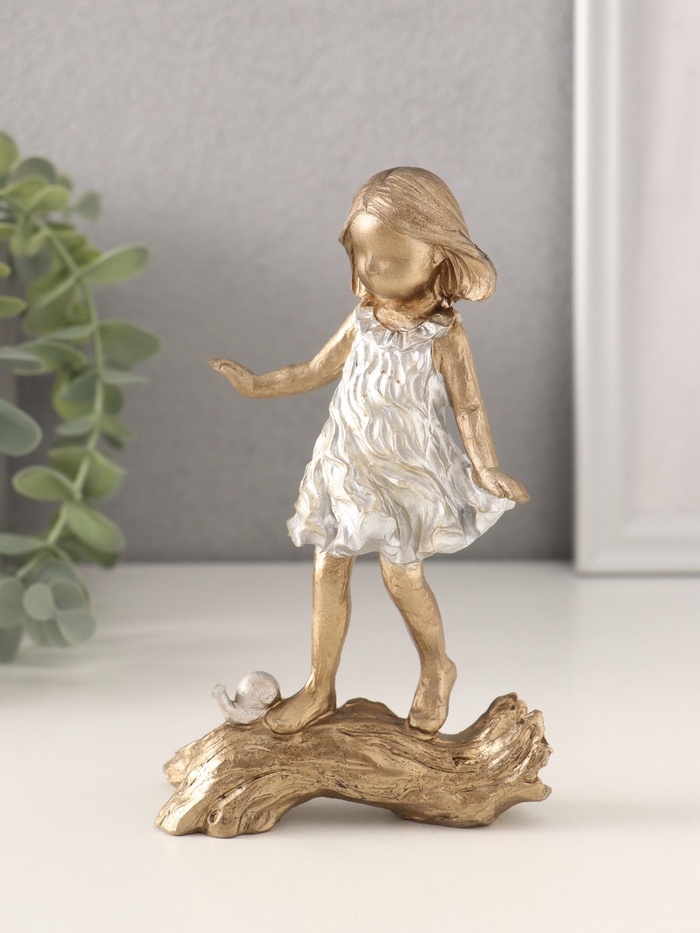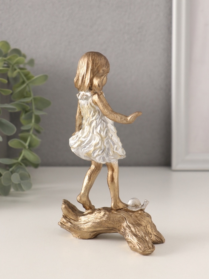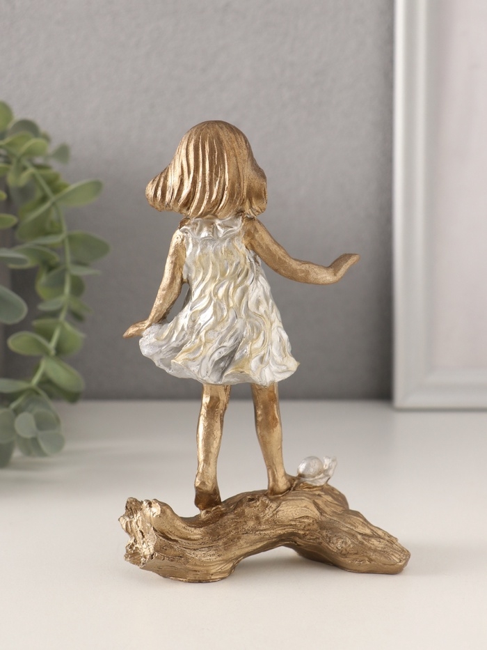 Сувенир полистоун "Малышка с улиткой на коряге" бронза с серебром 9,5х4,5х15 см