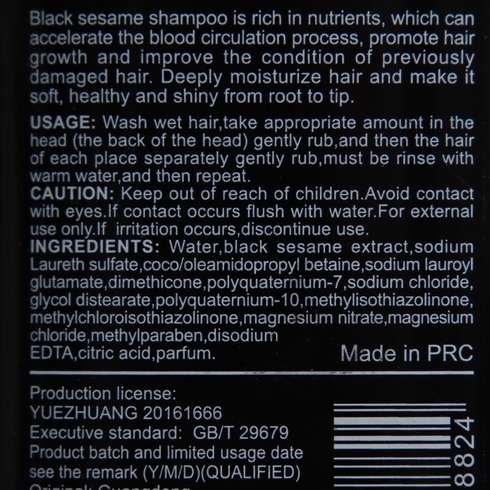 Состав: вода, экстракт черного кунжута, лауретсульфат натрия, кокамидопропил бетаин, лауроил глутамат натрия, диметикон, поликватерниум, натрия хлорид, гликоль дистеарат, поликватерниум, метилизотиазолинон, метилхлороизотиазолинон, магния нитрат, магния хлорид, метилпарабен, динатриевая соль ЭДТА дигидрат, лимонная кислота, ароматизатор.