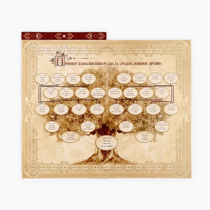 Книга на кольцах содержит 50 листов (включая инструкции и наименования разделов), лист генеалогического древа и 2 листа наклеек.