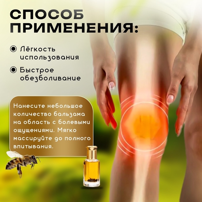 - Облегчение болей: Бальзам с ядом пчелы обладает противовоспалительными свойствами, помогая снизить боль и дискомфорт в мышцах и суставах.