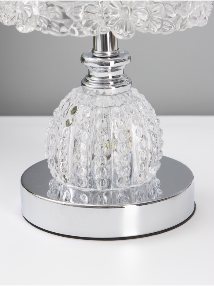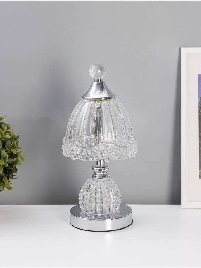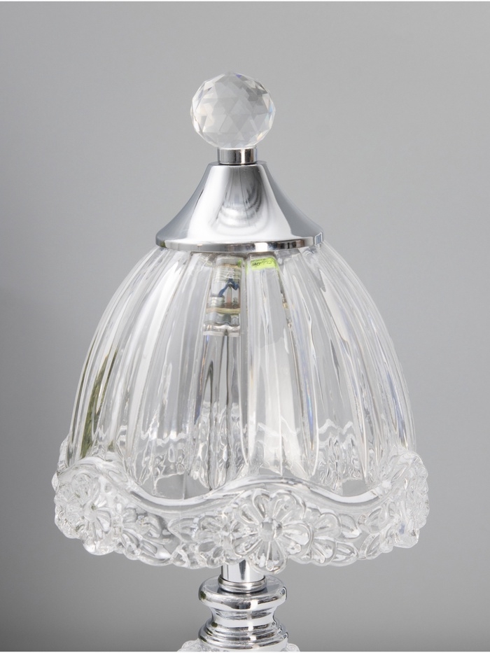 Лампа с хрустальным абажуром идеально подходит для классических и современных интерьеров. Дизайн с гравировкой и хрустальными деталями из акрила привлекает внимание и добавляет изысканности в любое пространство. Компактные размеры позволяют разместить лампу на прикроватной тумбочке, рабочем столе или полке.