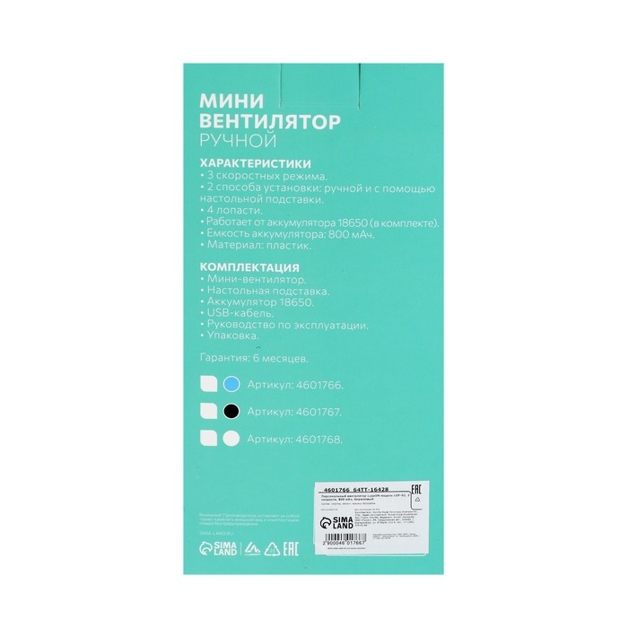 Портативный вентилятор Luazon LOF-02, 3 скорости, 800 мАч, бирюзовый