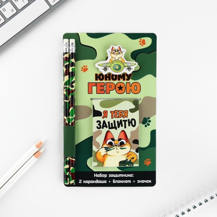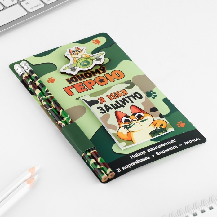 Подарочный набор: блокнот, карандаши (2 шт) и значок «Юному герою»