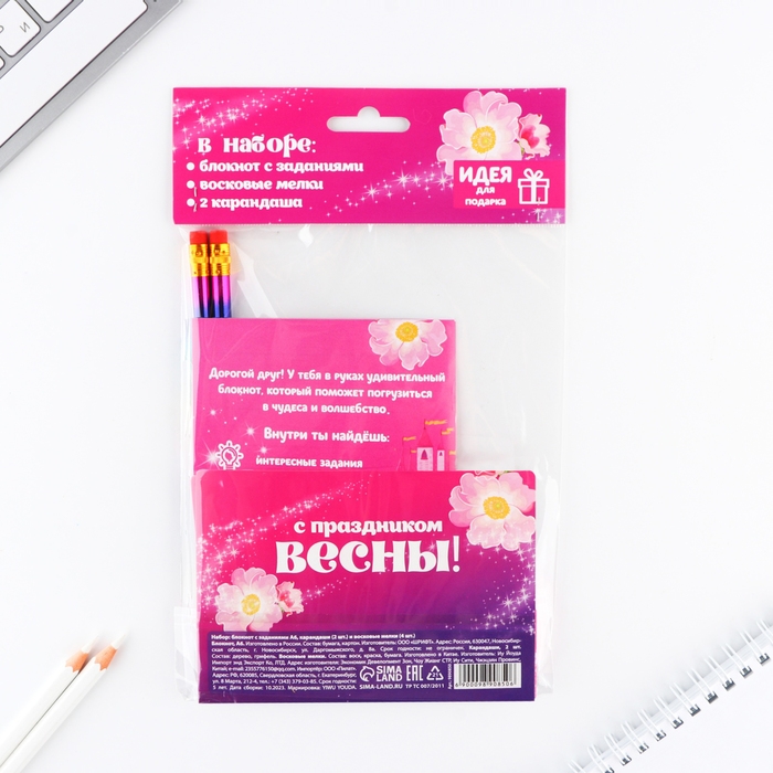 Набор: блокнот А6, карандаши (2 шт.) и восковые мелки (4 шт.) «С 8 марта»