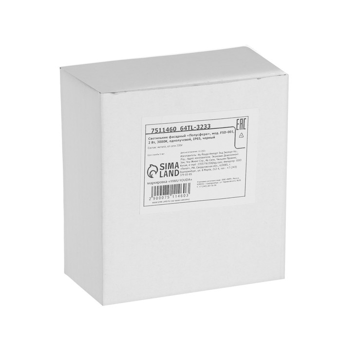 Светильник фасадный «Полусфера», FSD-007, 2Вт, 3000К, 1 луч, IP65, 220В, металл, черный