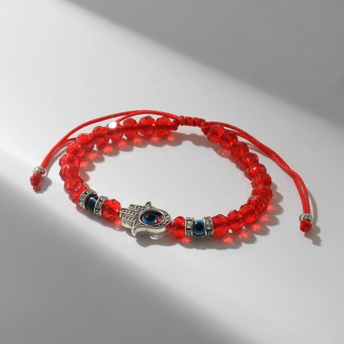 Браслет-оберег «Красная нить» рука счастья Хамса, хрусталики, цвет синий в чернёном серебре, d=8 см