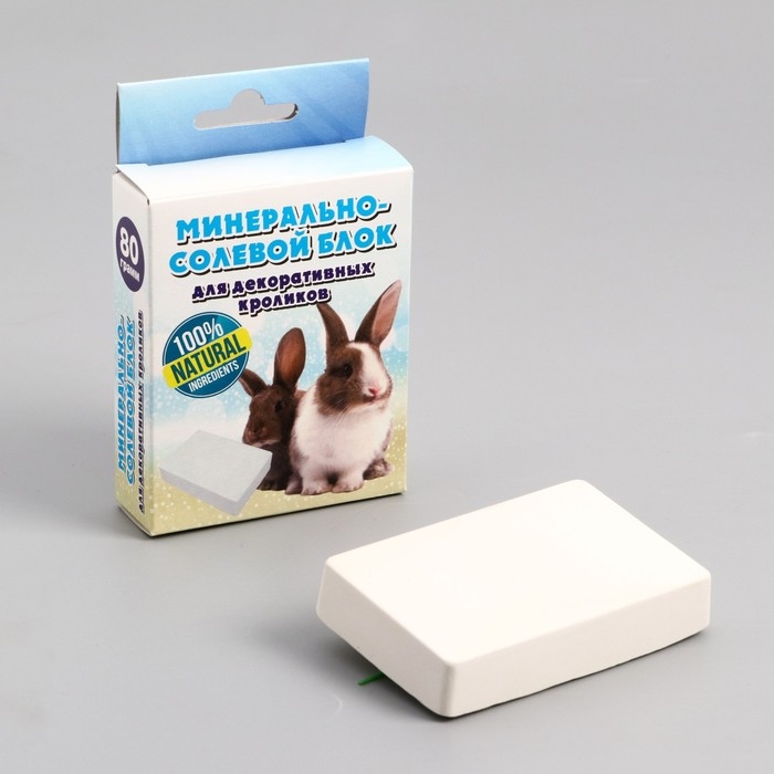 Минерально-солевой блок на 100% состоит из натуральных компонентов и разработан специально для декоративных кроликов. В состав входит соль повареная - являющаяся источником ионов хлора и натрия, которые необходимы для правильной работы всего организма. Также в состав входит мел кормовой - являющийся источником природного кальция, который необходим для укрепления костей и конечностей.
