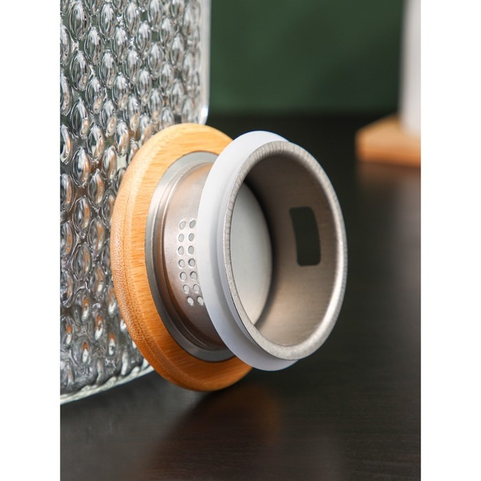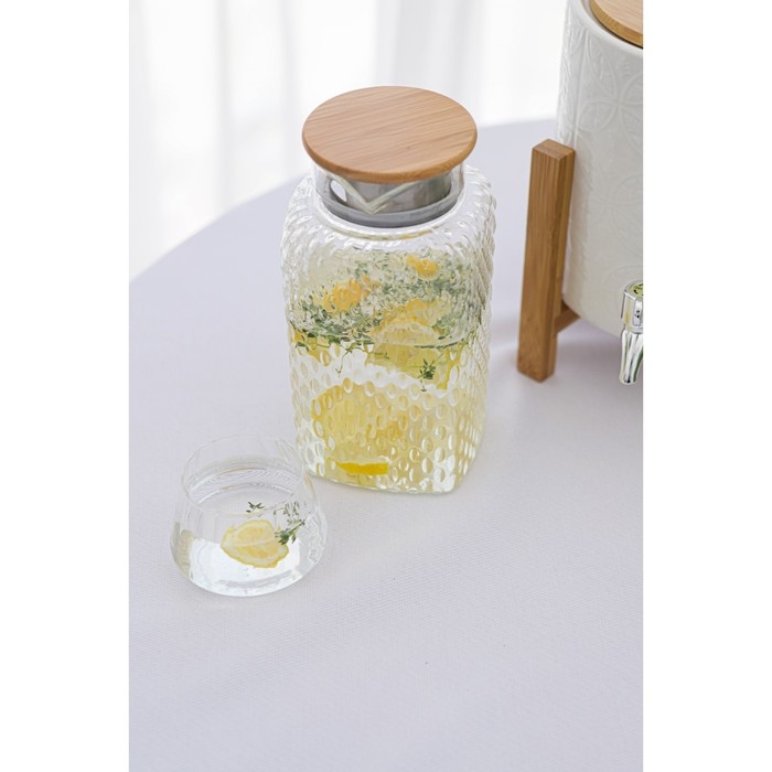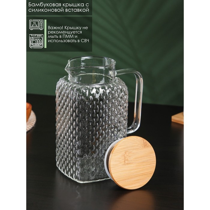 Кувшин для воды, чая, лимонада, морса, прохладительных и горячих напитков станет оригинальным украшением вашего стола. Фактурное стекло выглядит эффектно, а бамбуковая крышка оснащена фильтром, чтобы ягоды, фрукты и другие ингредиенты не попали в бокалы. Вы можете использовать данную модель как для холодных, так и для согревающих напитков.
