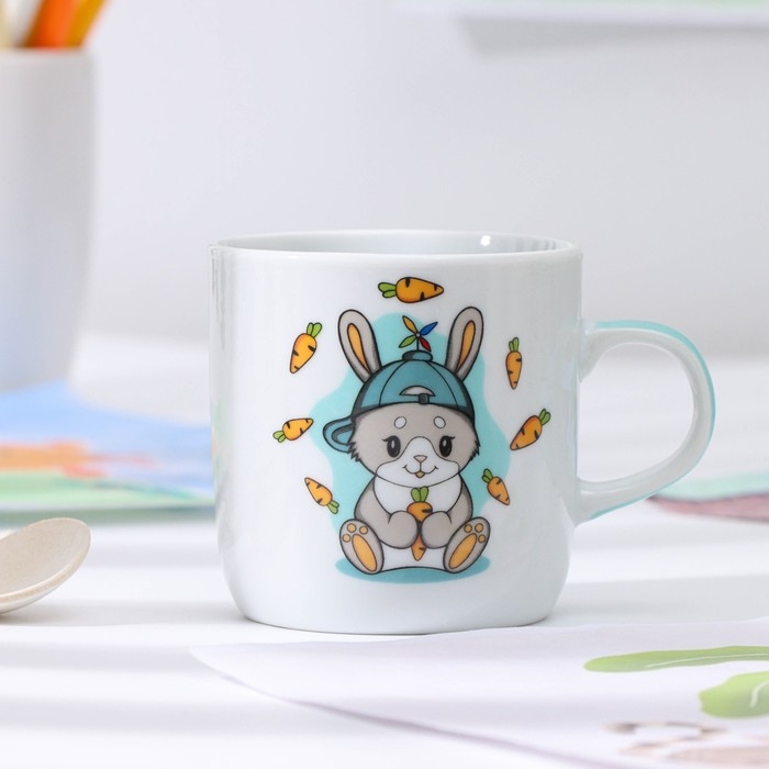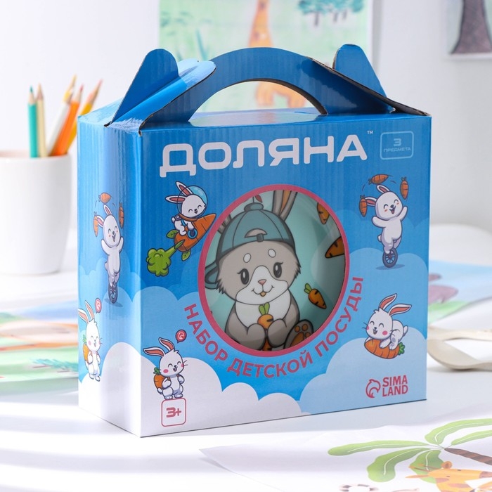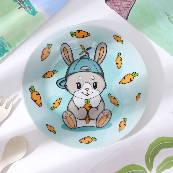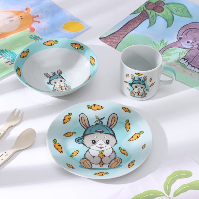Набор детской посуды из керамики Доляна «Милый зайка», 3 предмета: кружка 230 мл, миска 400 мл, тарелка d=18 см, цвет белый
