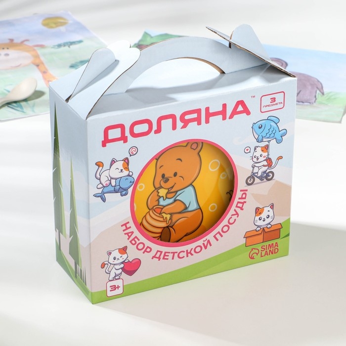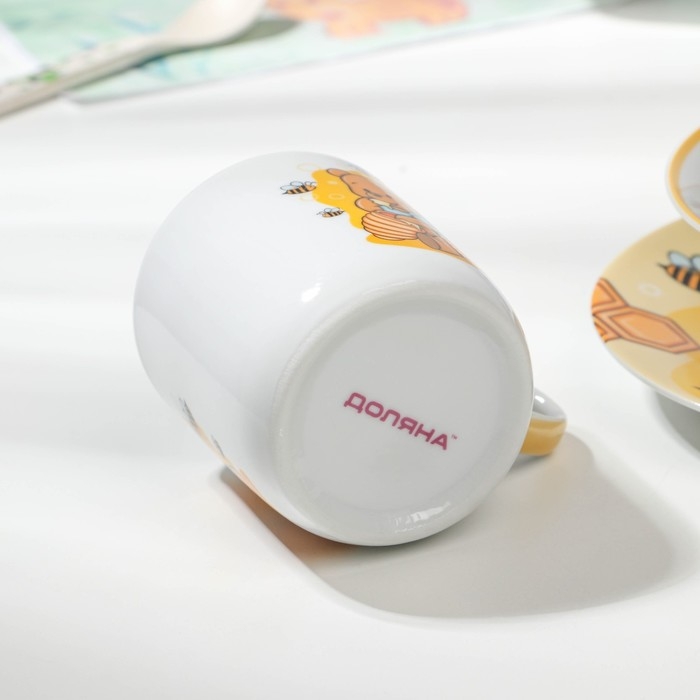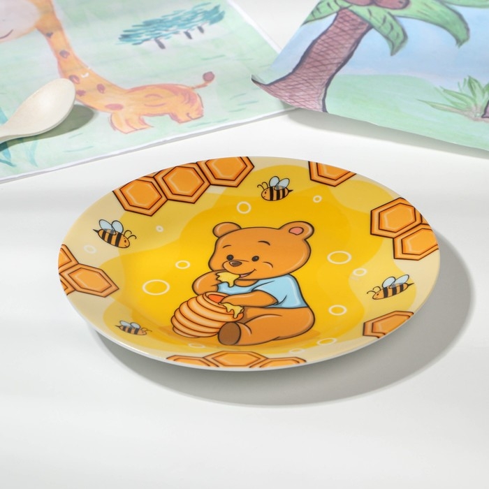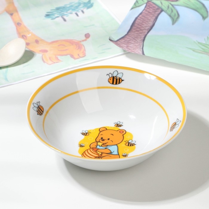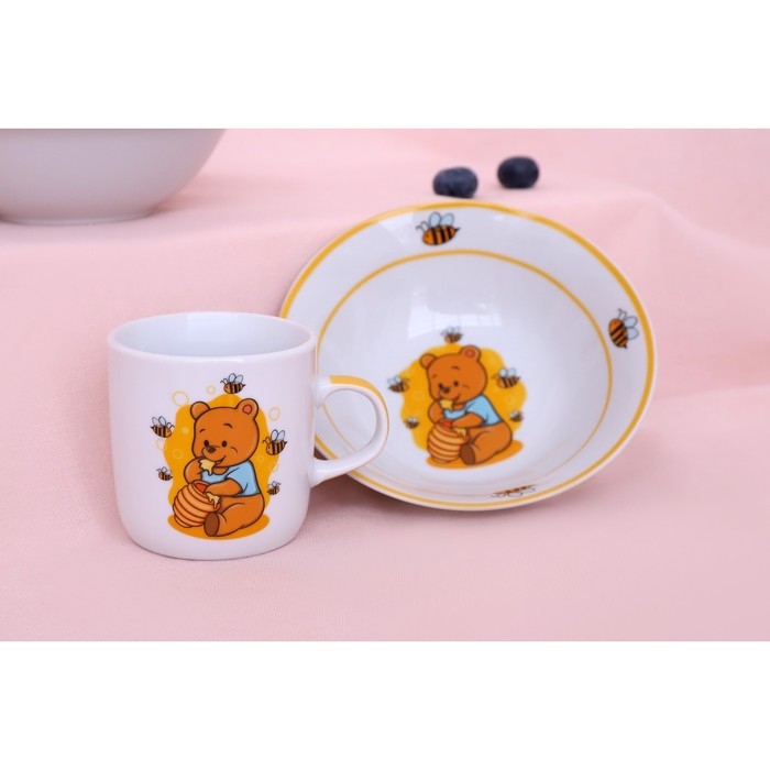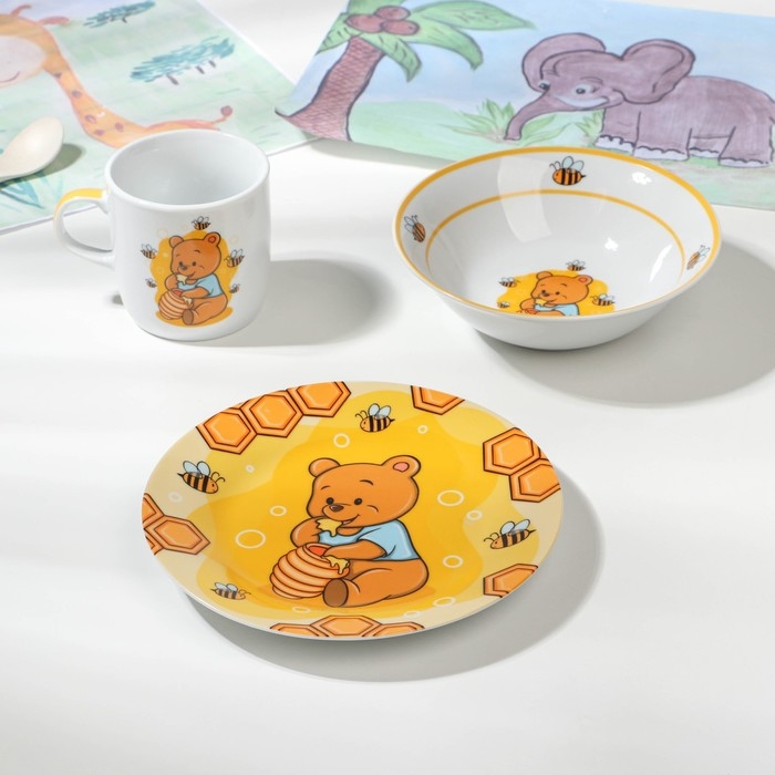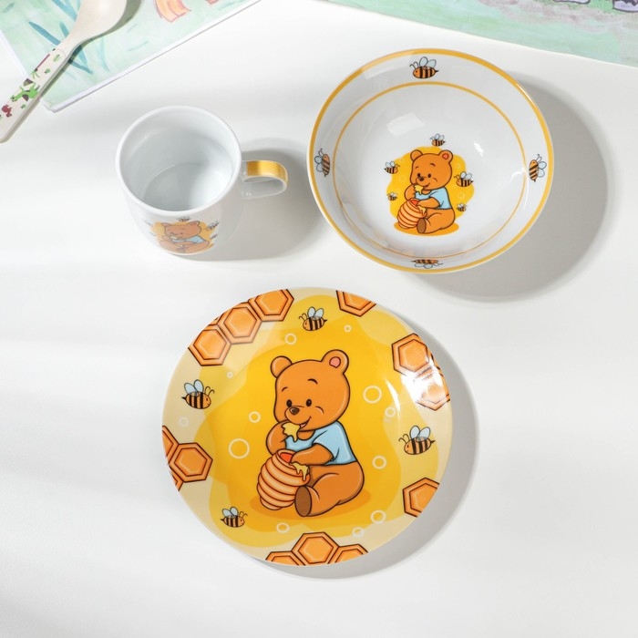 Набор детской посуды из керамики Доляна «Медвежонок и мёд», 3 предмета: кружка 230 мл, миска 400 мл, тарелка d=18 см, цвет белый