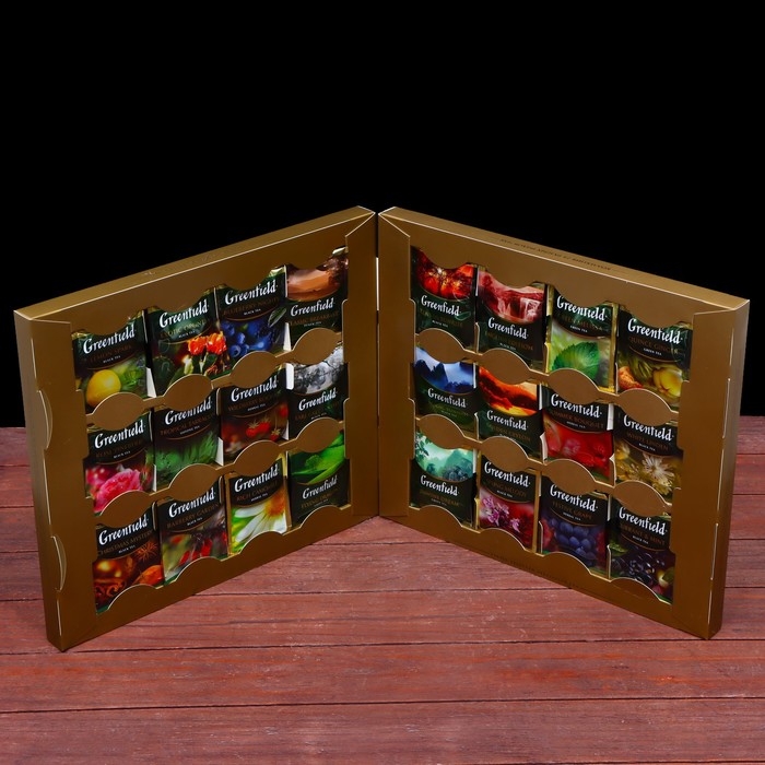 Коллекция листового чая Greenfield в пакетиках, 24 эксклюзивных вкуса – ярких и нежных, интригующих и насыщенных. Уникальная возможность оценить все разнообразие Greenfield вместе с семьей или за чтением книги. Прекрасный вариант подарка. Индивидуальная упаковка в термосаше из специальной фольги гарантирует исключительную свежесть чая и удобство использования. Рекомендация по приготовлению-положить в чашку по одному пакетику на человека. Залить кипятком и настаивать 2-3 минуты.