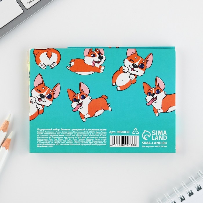 Подарочный набор блокнот-раскраска и восковые мелки «Корги»