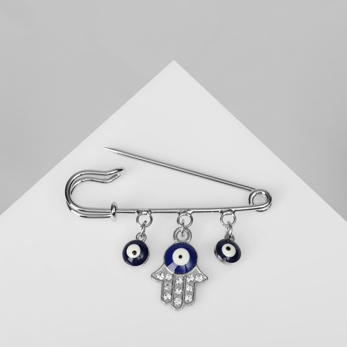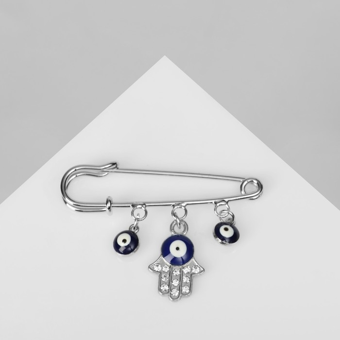 Булавка-оберег 3 подвески «Рука Хамса с бусиной», 5 см, цвет синий в серебре