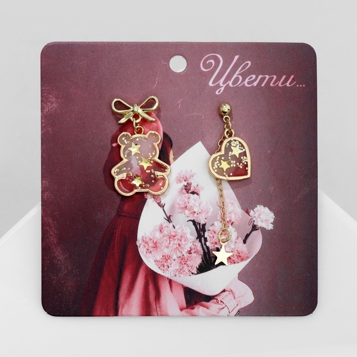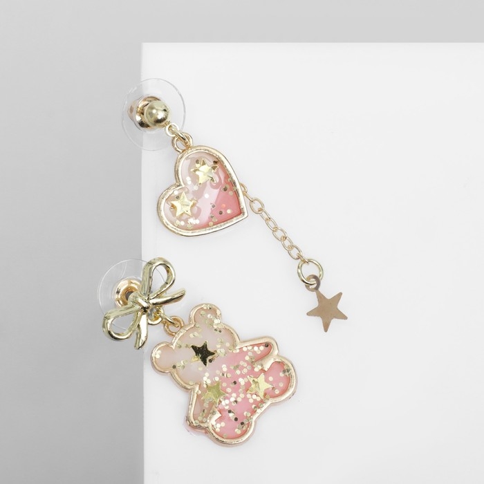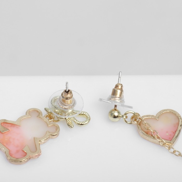 Серьги с эмалью «Мишка» и сердце, романтика, цвет бело-розовый в золоте