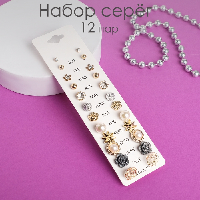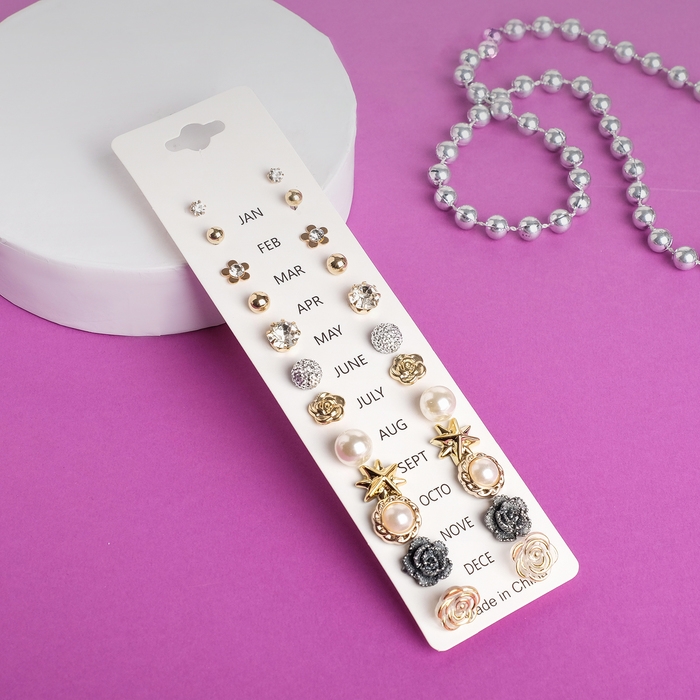 Пусеты 12 пар One year, романтика, цвет бело-серый в золоте