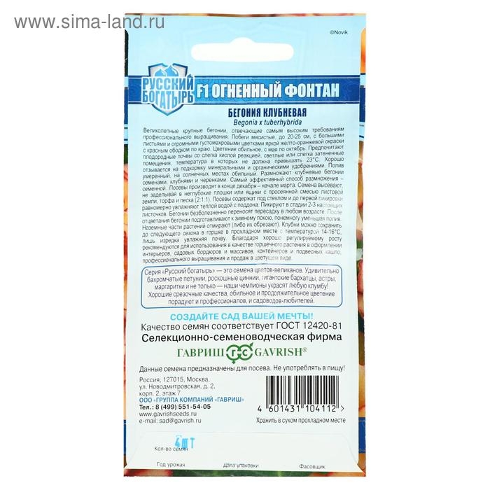 Семена цветов Бегония "Огненный фонтан", ц/п, F1, серия Русский богатырь, гранулы, 4 шт