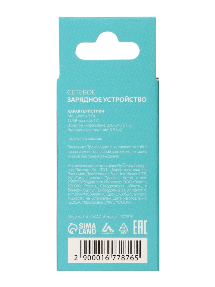 Сетевое зарядное устройство Luazon LN-100AC, 1 USB, 1 А, чёрное