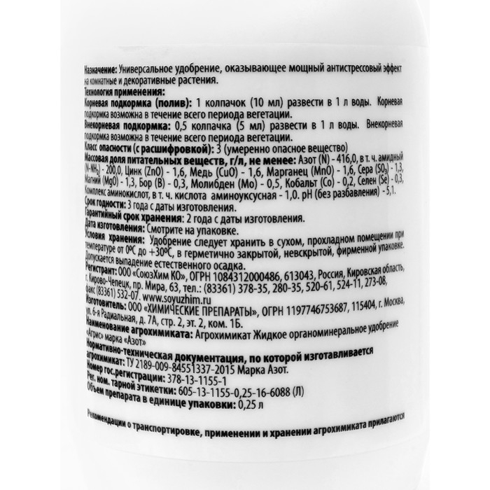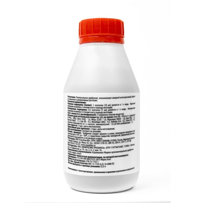 Массовая доля питательных веществ (элементов питания), г/л: азот (N) — 416.0, в т. ч. мочевинный (N-NH₂) — 200.0, цинк (ZnO) — 1.6, медь (CuO) — 1.6, марганец (MnO) — 1.6, сера (SO₃) — 1.3, магний (MgO) — 1.3, комплекс аминоксилот, в т. ч. кислота аминоуксусная — 1.0, железо (FeO) — 0.2, бор (B) — 0.3, молибден (Mo) — 0.5, кобальт (Co) — 0.2, селен (Se) — 0.3, pH (без разбавления) — 5,1.