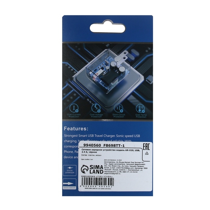 Сетевое зарядное устройство GQ-1, USB, 2.4 А, чёрное