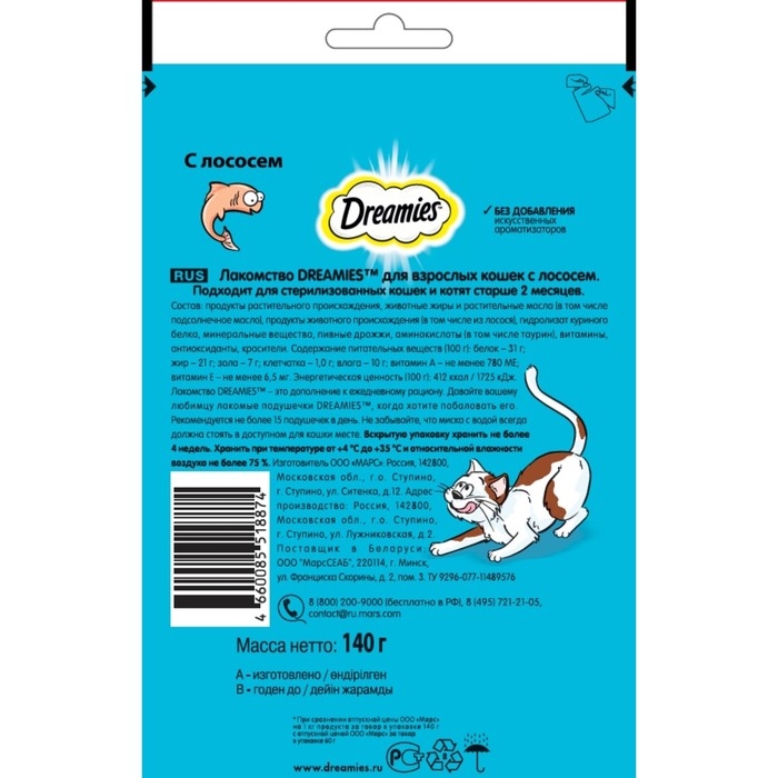 Подушечки Dreamies идеально подойдут как для повседневного лакомства, так и для поощрения за хорошие поступки!