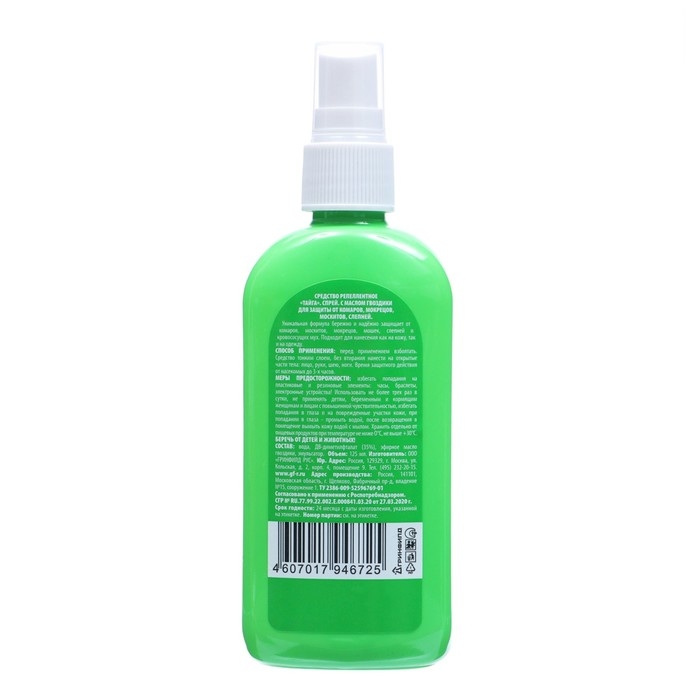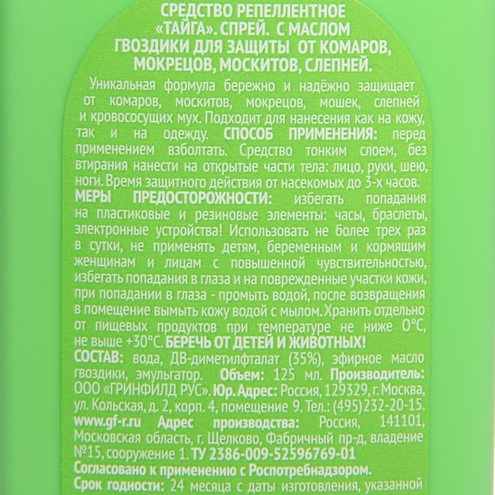 Репеллентный спрей торговой марки «Тайга» оптимально подходит для защиты от комаров, москитов и других кровососущих насекомых. Его можно использовать всей семье на прогулке, во время пикника на природе или работы на даче. Содержащее эфирное масло гвоздики средство наносится на открытые части тела, обеспечивая надежную защиту на протяжении трех часов. Благодаря распылителю удобно обрабатывать сразу большие участки кожи. Состав: Вода, ДВ-диметилфталат (35%), эфирное масло гвоздики, эмульгатор. Способ применения: перед применением взболтать. Средство тонким слоем, без втирания нанести на открытые части тела: лицо, руки, шею, ноги.