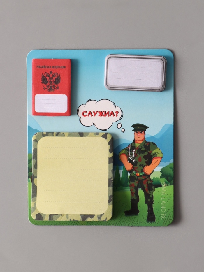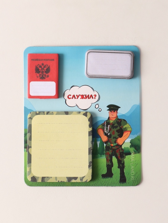 Магнит с блоком для записей и стикерами "Служил?" 10х12 см