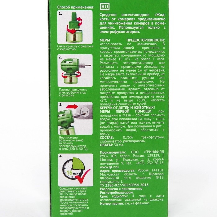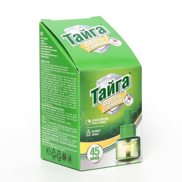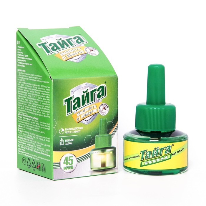Жидкостный наполнитель 45 ночей. Тайга Ликвид 45 ночей это средство для борьбы с комарами продленного действия. Одного такого флакона будет достаточно для надежной защиты жилых помещений от комаров до 45 ночей. Как и все жидкостные наполнители для электро фумигаторов, выпускаемых под маркой "Тайга", это средство абсолютно безопасно для домашних животных. Эффективно работает при открытых окнах.