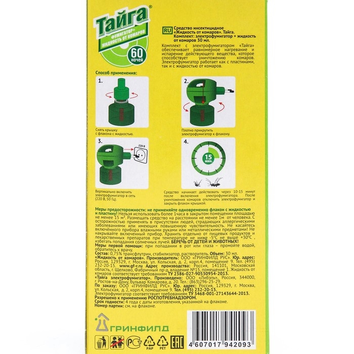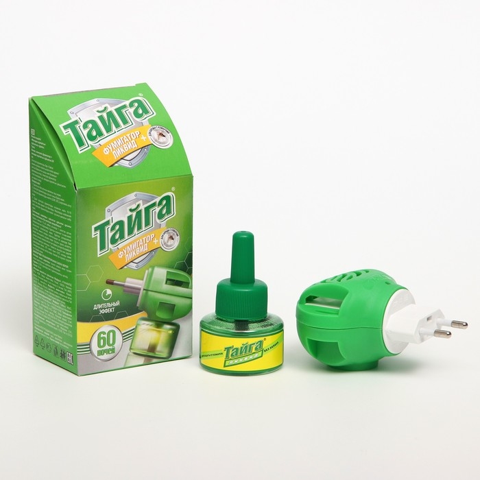 Жидкостный наполнитель 60 ночей и электро фумигатор. Комплект "Тайга" надежно защитит ваш дом от комаров. Набор укомплектован жидкостным наполнителем длительностью 60 ночей, а также универсальным прибором, который подойдет и для использования пластин от комаров.