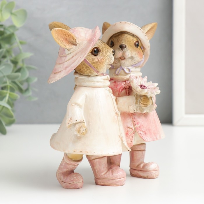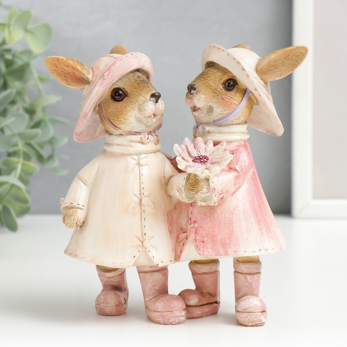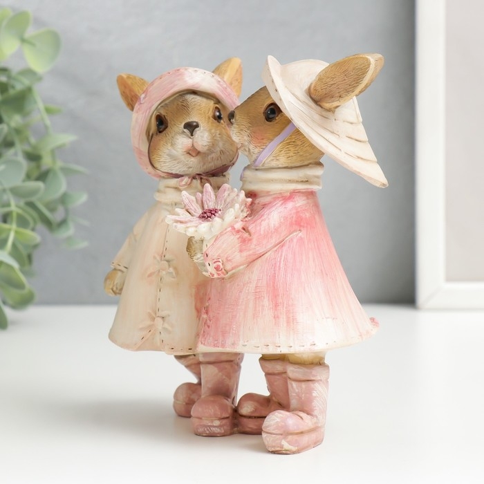 Сувенир полистоун "Зайчики в шляпках и дождевиках, с цветком" 13,5х8х13 см
