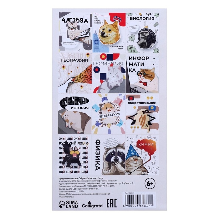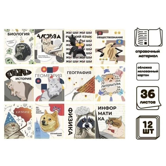 Комплект предметных тетрадей 36 листов "Животные мемы", 12 предметов, со справочным материалом, обложка мелованная бумага, блок №2 (серые листы)
