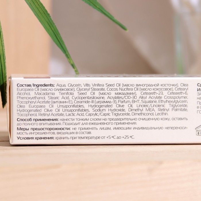 Состав: aqua, glycerin, vitis vinifera seed oil (масло виноградной косточки), olea europaea oil (масло оливковое), glyceryl stearate, cocos nucifera oil (масло кокосовое), cetearyl alcohol, macadamia ternifolia seed oil (масло макадамии), ceteareth-23, ceteareth-6, phenoxy-ethanol, stearic acid, triglyc-eride, dimethiconol, lecithin.