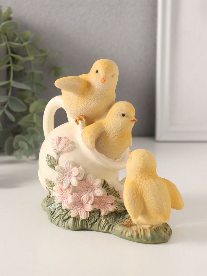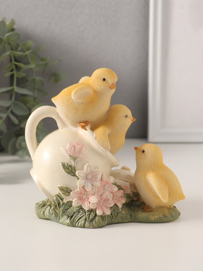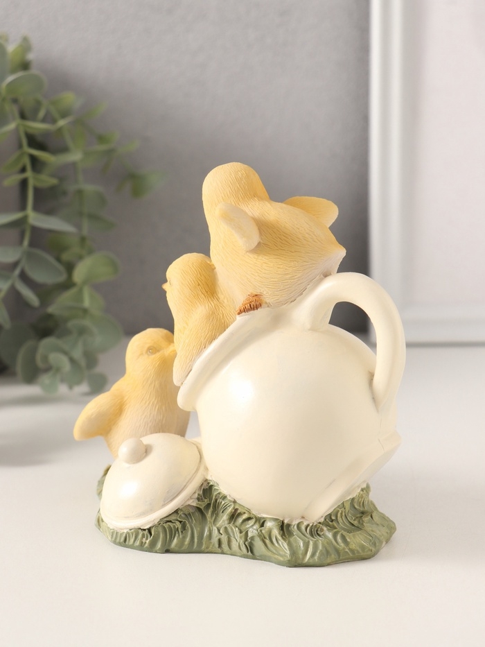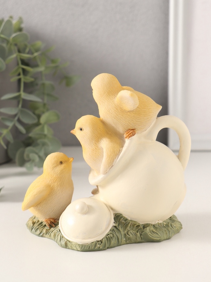 Сувенир полистоун "Три цыплёнка и фарфоровый чайничек на лужайке" 12,5х8х12 см