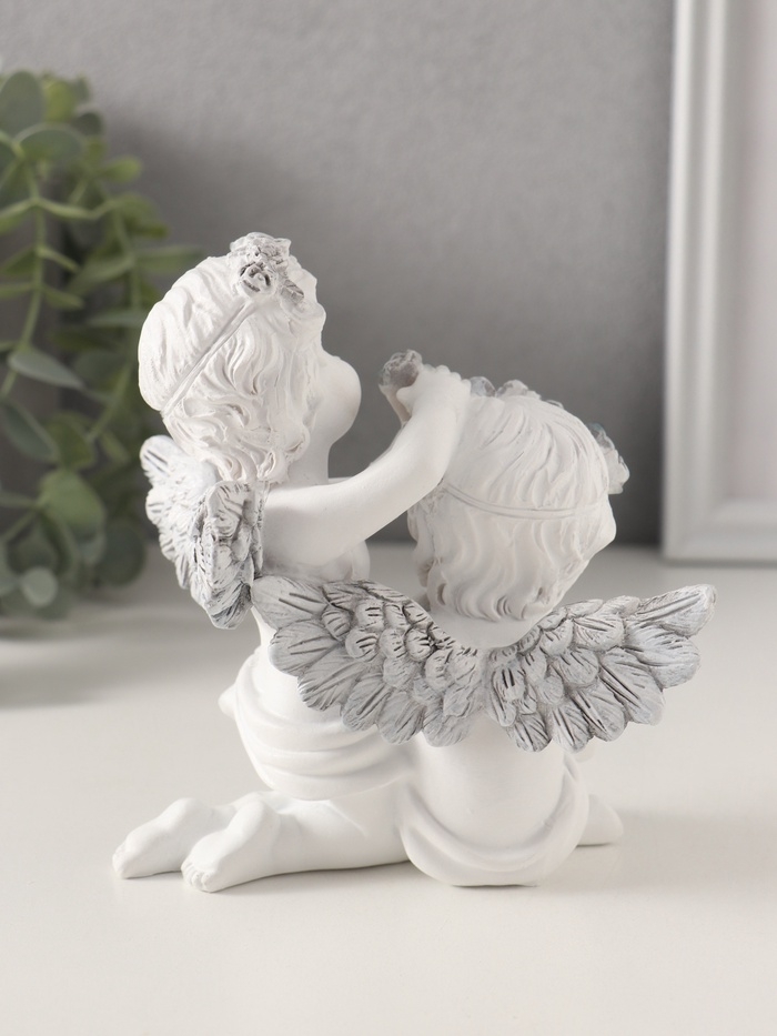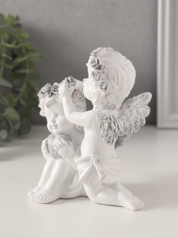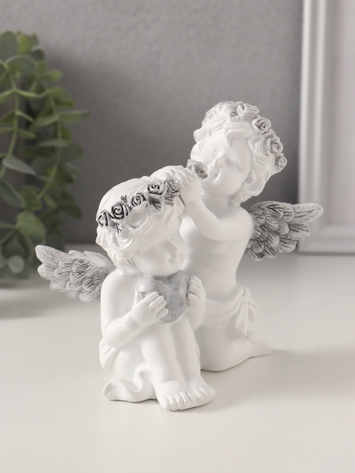 Сувенир полистоун "Ангелочки вплетают венок в волосы, с сердцем" бело-серый 11х8х12,5 см