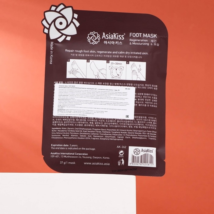 Интенсивно-восстанавливающая маска-носки для ног «Улитка» от знаменитого бренда корейской косметики Asiakiss подарит роскошный уход вашим ногам. Улиточный муцин интенсивно увлажняет кожу и глубоко питает клетки, придавая вашим ступням мягкость и ухоженный вид. Также фильтрат моллюска с маслом оливы и жожоба прекрасно заживляют натоптыши и мозоли, в комплексе с экстрактами подсолнуха и ромашки оказывает противогрибковый и антибактериальный эффект. Благодаря глубокому увлажнению предотвращаются трещины и уменьшается дискомфорт от старых. Экстракт розы улучшает кровообращение и смягчает кожу. Использовав увлажняющую маску для ног всего раз вы уже сможете почувствовать магические свойства муцина для здоровья ваших ступней.