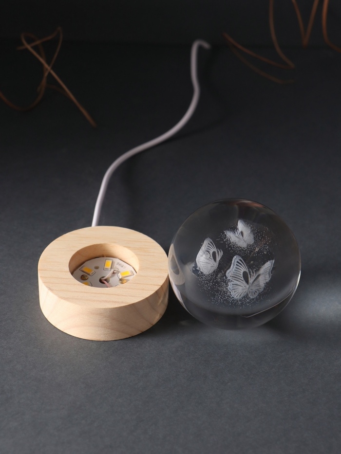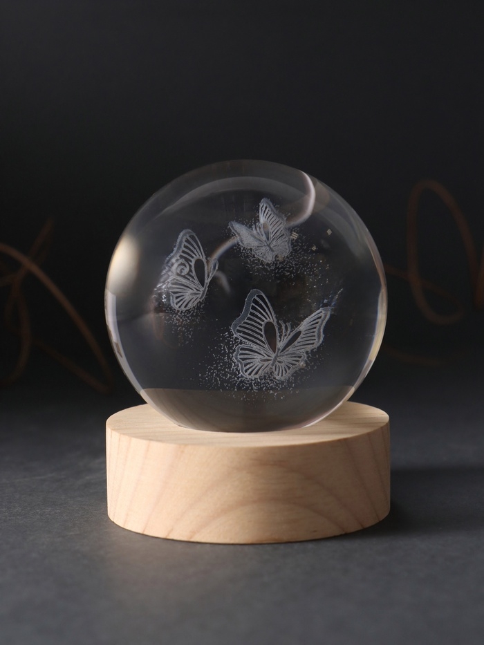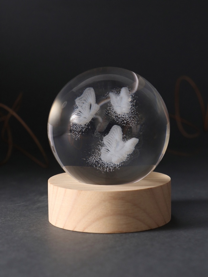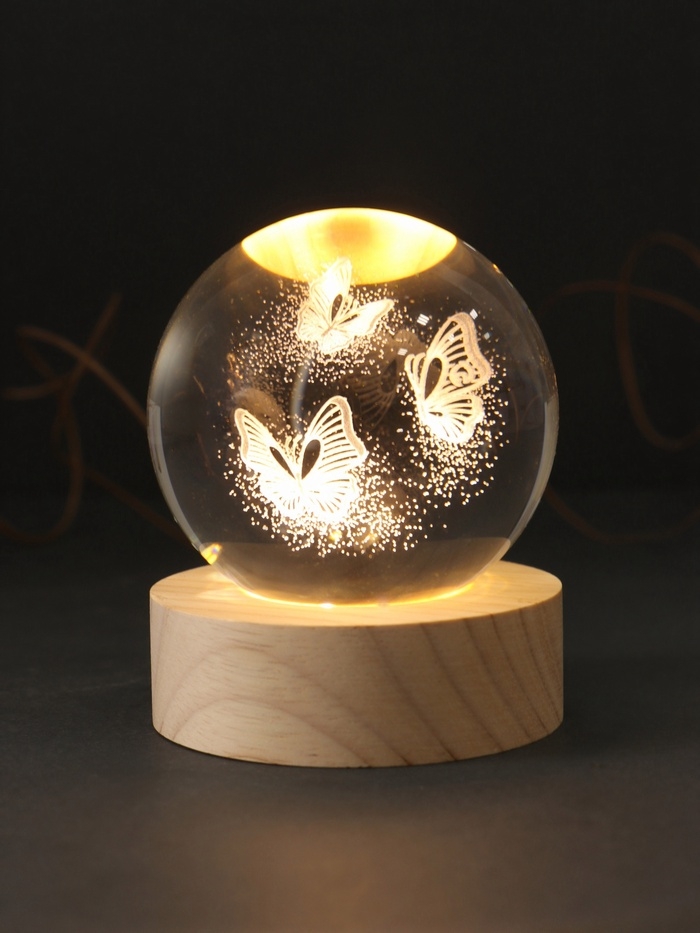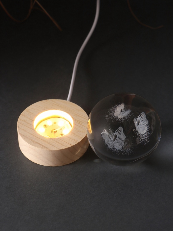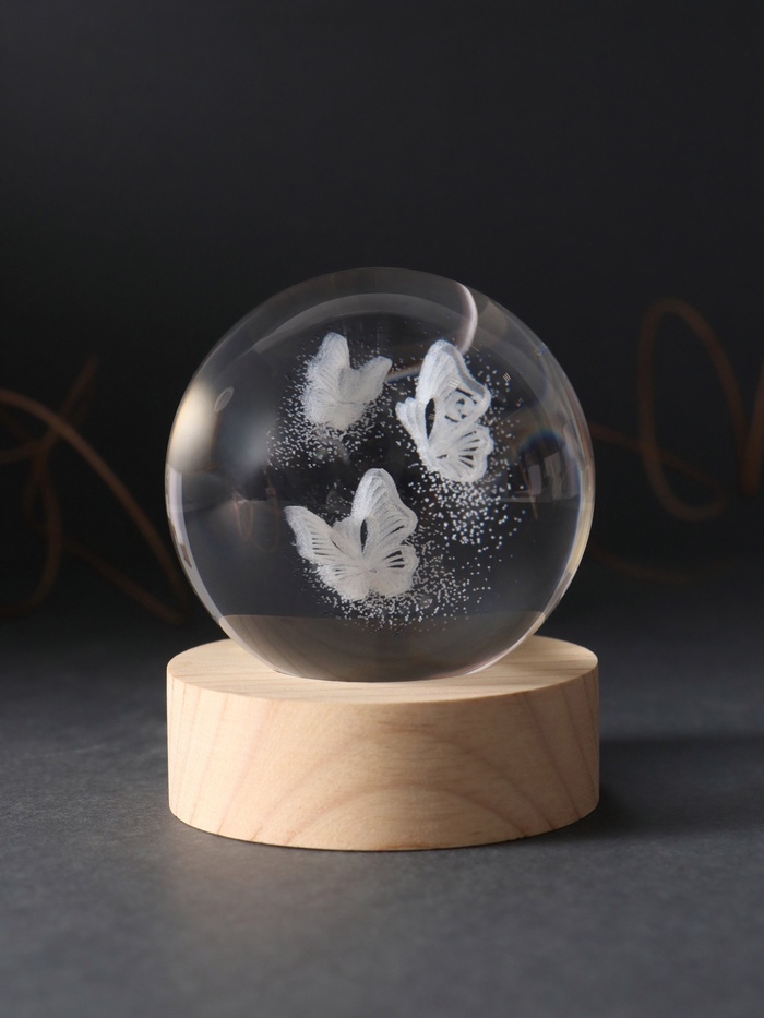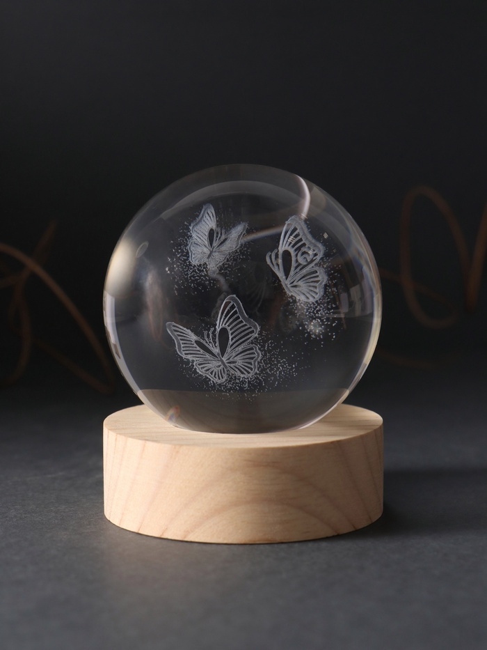 Сувенир стекло подсветка "Шар. Бабочки" d=6 см подставка дерево, USB