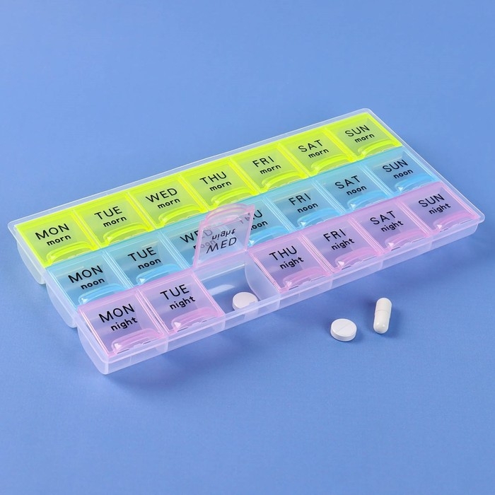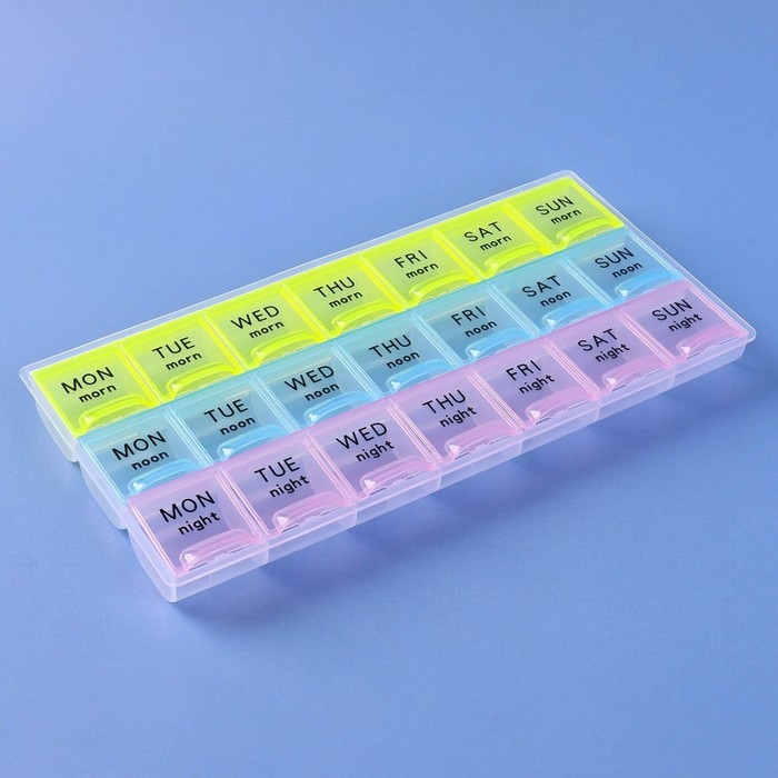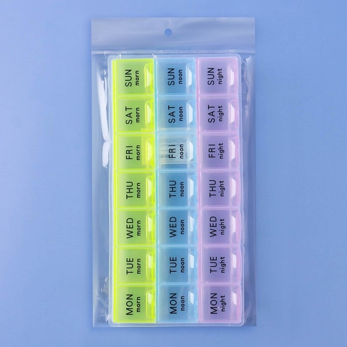 Таблетница - органайзер «Неделька», утро/день/вечер, 21,5 × 9 × 2 см, 21 секция, в коробке, разноцветная