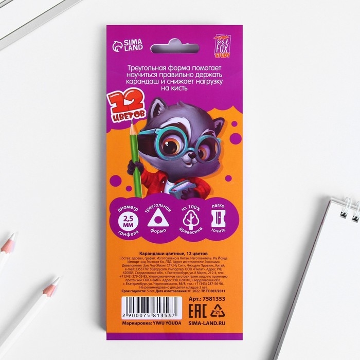Цветные карандаши 12 цветов заточенные трехгранные деревянный корпус