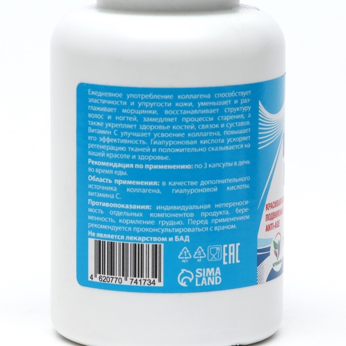Состав: гидролизат рыбного коллагена, аскорбиновая кислота, гиалуроновая кислота, антислеживающий агент кремния диоксид, капсула (желатин, вода).