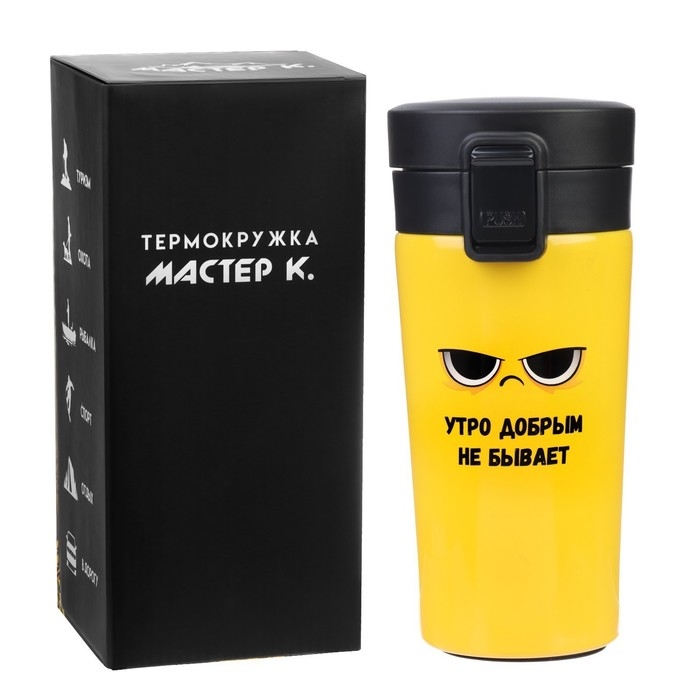Термокружка для кофе и чая "Мастер К" идеальна для офиса, автомобиля, длительных прогулок и детям в школу. Благодаря специальному покрытию надежно лежит в руке.
