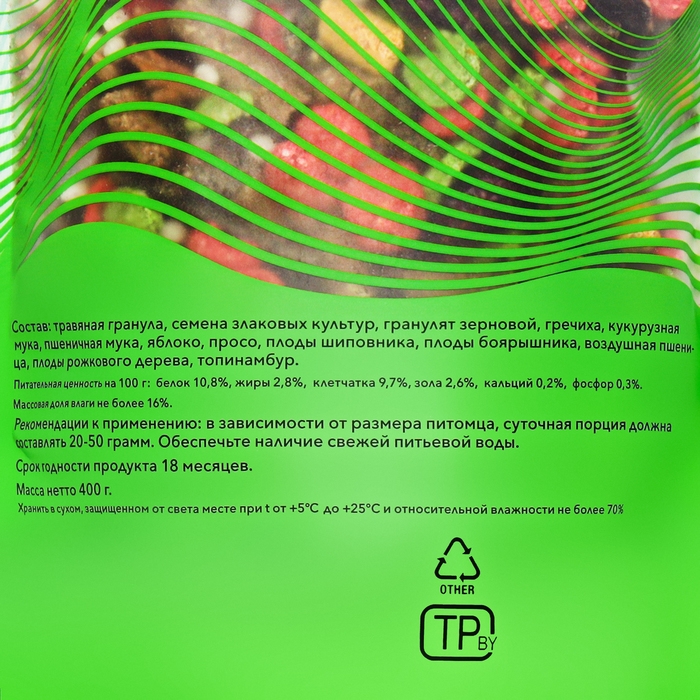 Рецептура этого корма состоит из сухофруктов, овощных и травяных смесей.