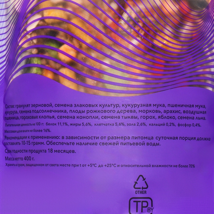 При сборе кормов мы используем цельные зерна семян, за счет чего в них сохраняются все необходимые витамины и микроэлементы. Пшеница является мощным стимулятором моторики кишечника; Ячмень содержит в своем составе уникальный набор важных для организма макро и микроэлементов; Арахис богат белками, полиненасыщенными жирами и полезными питательными веществами; Кукурузные хлопья богаты белками, минеральными солями, витаминами группы В, жирами и углеводами; В семенах подсолнечника большое количество жирной кислоты, которая оказывает позитивное воздействие на шерсть; Семена льна защищают желудочно-кишечный тракт, улучшают аппетит.