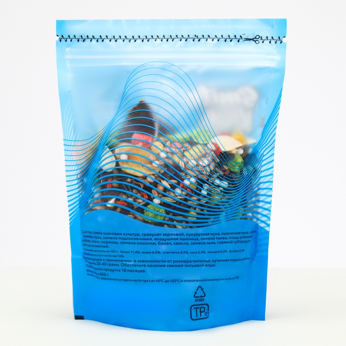 Семена злаковых культур, гранулят зерновой, кукурузная мука, пшеничная мука, кукуруза, гречиха, горох, семена подсолнечника, воздушная пшеница, семена тыквы, плоды рожкового дерева, изюм, морковь, семена конопли, банан, свекла, семена льна, говяжий субпродукт дегидрированный.