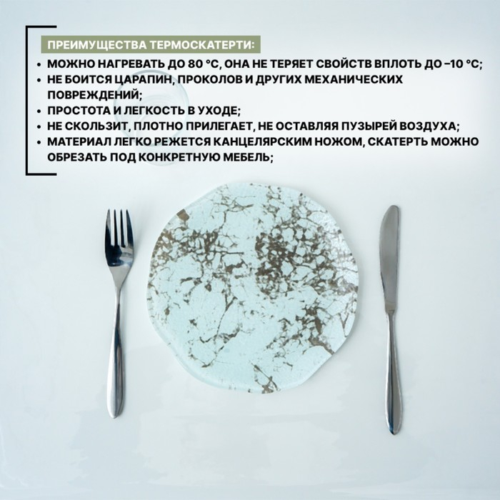 - Подходит для любой поверхности мебели: натурального или искусственного камня, деревянных и стеклянных столов. Также можно использовать поверх тканевой скатерти.