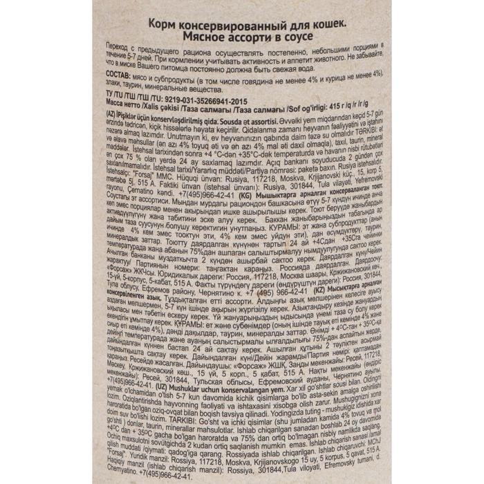 Корм консервированный для кошек. Мясное ассорти в соусе.