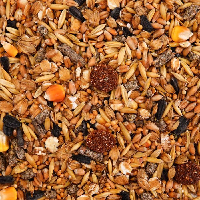 Состав: пшеница, овёс, просо жёлтое, ячмень воздушный, гранулы зерновые, кукуруза, семечка чёрная, гранулы экстрадированные, арахис.