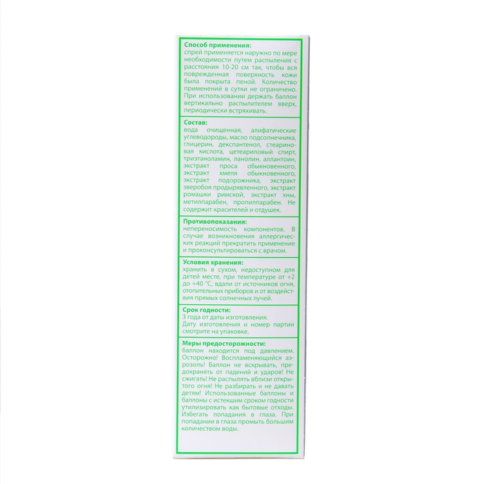 Способ применения: применяется наружно по мере необходимости путем распыления с расстояния 10-20 см так, чтобы вся поврежденная поверхность кожи была покрыта пеной. Количество применений в сутки не ограничено. Перед применением необходимо тщательно встряхнуть баллон.