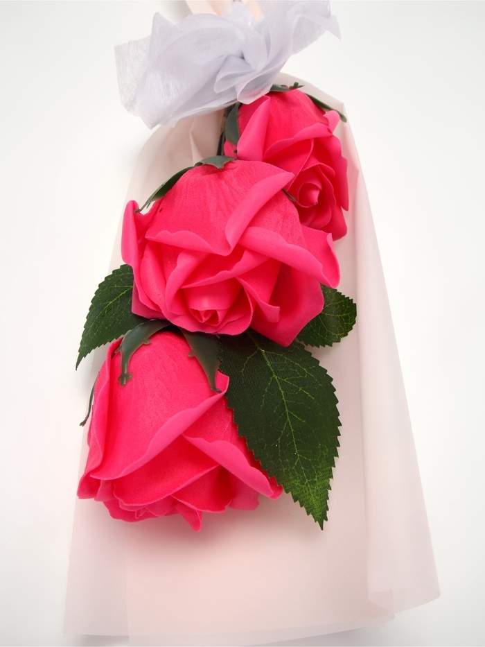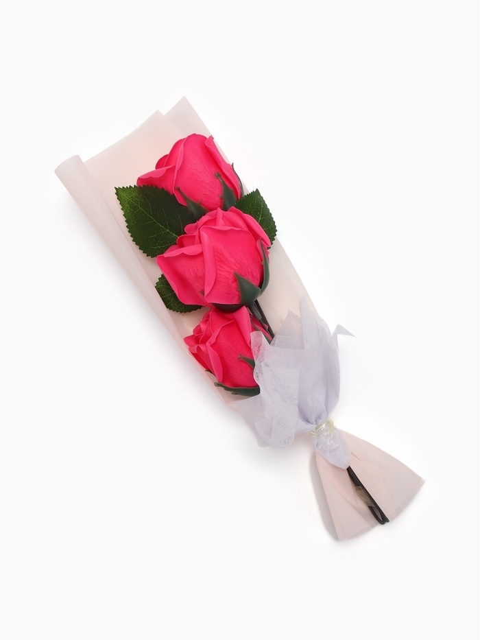 Букет из трех мыльных фуксия роз в колбе.