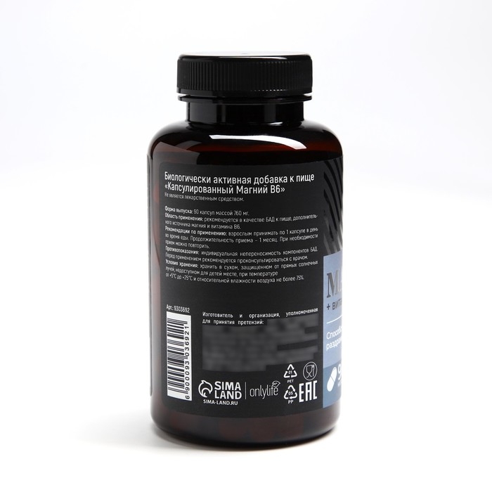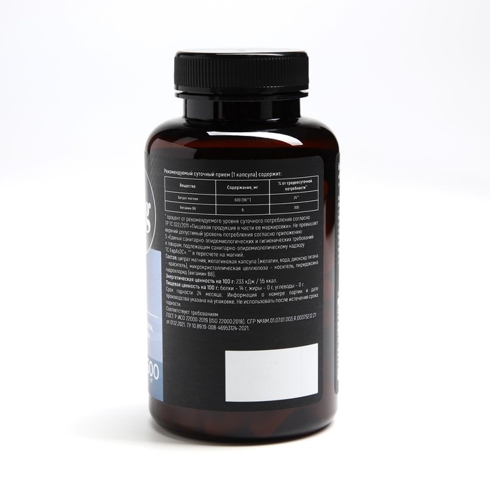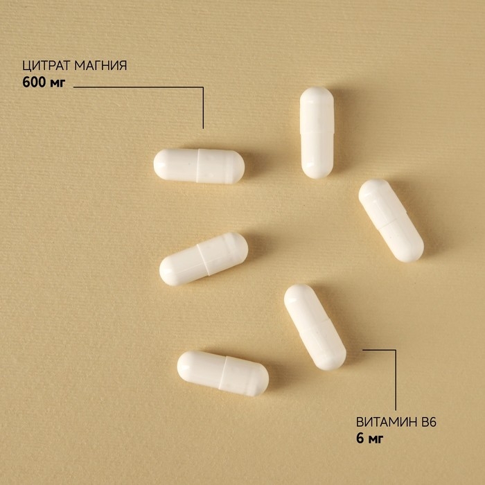 Состав: цитрат магния, желатиновая капсула (желатин, вода, диоксид титана - краситель), микрокристалическая целлюлоза - носитель, пиридоксина гидрохлорид (витамин В6).