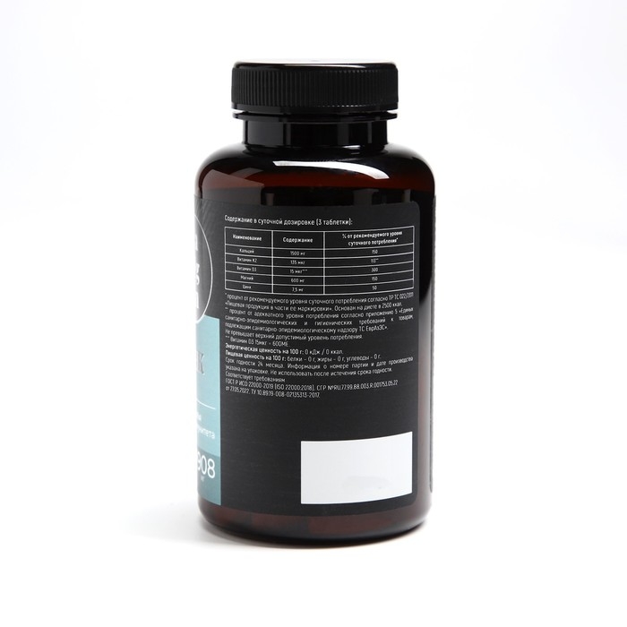 Состав: карбонат кальция, оксид магния, карбоксиметилкрахмал натрия, гидроксипропилметилцеллюлоза - загуститель, карбоксиметилцеллюлоза натрия - загуститель, стеарат магния - стабилизатор, менахинон, оксид цинка, диоксид титан- краситель, холекальциферол, полиэтиленгликоль - глазирователь, тальк - антислеживающий агент.